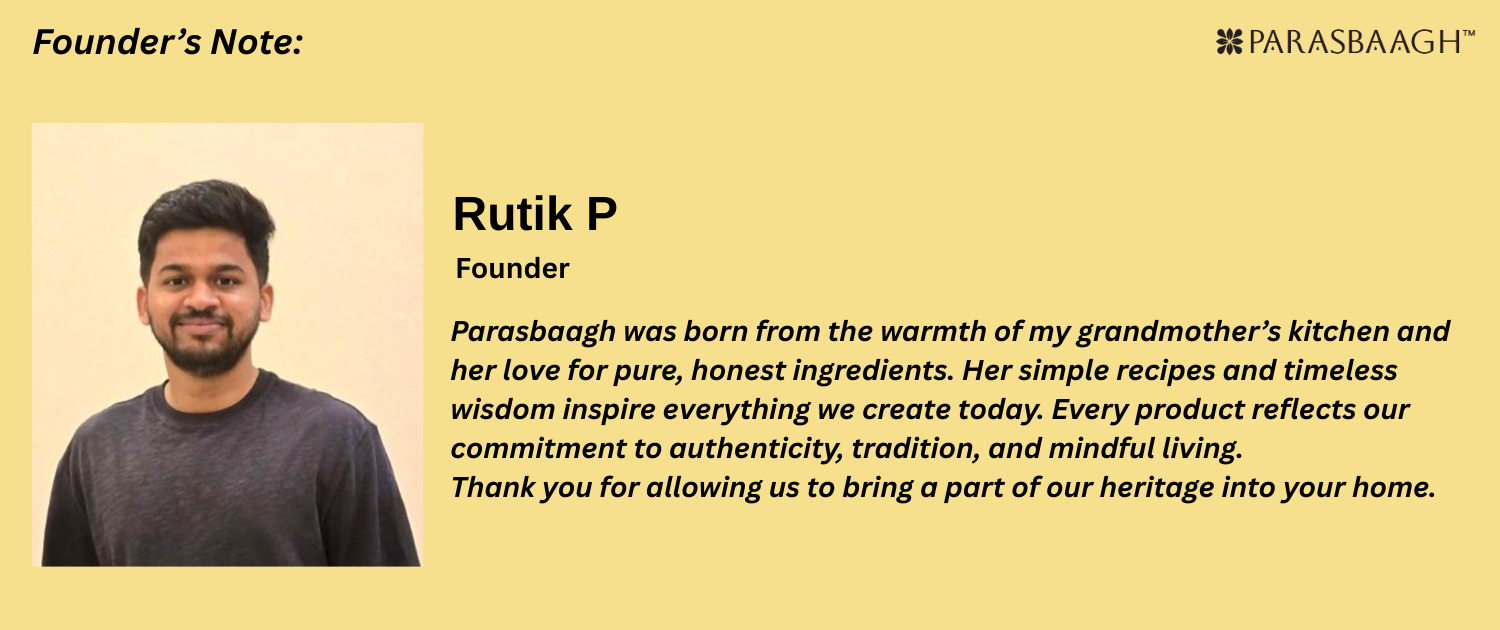Parasbaagh began with a simple memory of a grandmother’s warm, comforting home. Inspired by those fragrant afternoons and soulful recipes, it grew from handpicked teas into a collection of heartfelt creations. Each product is an ode to the love that grounds and nourishes us, inviting you to slow down and savour nature’s comfort.